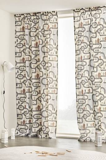Två gardinlängder av bomull med mönstertryck i milda, harmoniska färger. Motivet är en myllrande stad med vägar, hus, djur och natur. Längderna har påsytt multifunktionsband och kan hängas upp med fingerkrokar, kanal samt dold hälla. Licensnummer & testinstitut: CU 829732 Control Union Certifications. Produkten är certifierad med Global Organic Textile Standard (GOTS), vilket innebär att den innehåller ekologiskt material som är odlat utan kemiska bekämpningsmedel, konstgödsel och genmodifierade grödor (GMO). Produkten uppfyller GOTS sociala och miljömässiga krav på ansvarsfull tillverkning från odling till slutprodukt. Material: 100% bomull. Storlek: Bredd per längd 145 cm. Välj längd vid beställning. Skötselråd: Tvätt 60°. Krympning max 5%. Tips/råd: ALVIN är en kollektion med både sängkläder och gardiner, så du kan matcha precis som du vill ha det.