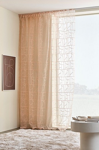 En gardinlängd i organza av polyester och polyamid med broderat, oregelbundet nätmönster. Mönstret har inspirerats av bojagi som är koreansk lappteknik. Den skira längden har påsytt multifunktionsband och kan hängas upp med fingerkrokar, kanal samt dold hälla. Material: 50% polyester och 50% polyamid. Storlek: Bredd per gardinlängd 140 cm. Välj längd vid beställning. Skötselråd: Tvätt 40°. Krympning max 3%. Tips/råd: Matcha med enfärgat och få läcker effekt.