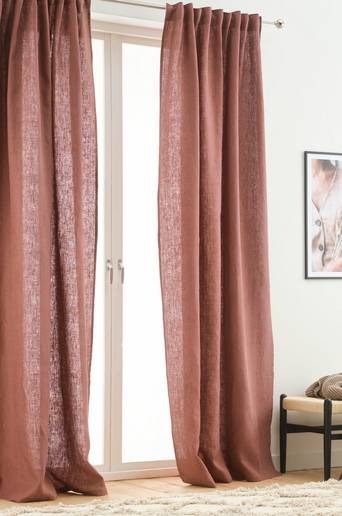 Två enfärgade gardinlängder i härligt linne med fin struktur som ger en exklusiv känsla. Med påsytt multifunktionsband. Gardinen kan hängas upp med fingerkrokar, kanal samt dold hälla. Lin är ett fint naturmaterial som blir mjukare och mer följsamt med tiden. Ett tips för att få extra mjukt och fint fall är att använda en steamer när du hängt upp linnegardinerna på plats. Steamern kombinerar värme med ånga och gör gardinerna mer följsamma. Material: 100% lin. Storlek: Bredd per gardinlängd 145 cm. Välj längd vid beställning. Skötselråd: Tvätt 40°. Krympning max 5 %. Förläng livstiden på gardinerna genom att dammsuga dem försiktigt med mjukt munstycke med jämna mellanrum. På så vis undviker du att damm och smuts tränger in i tyget. Dessutom behåller dina gardiner färgen längre. Fläckar tas bort med varmt vatten på en ljus trasa. Dutta fläcken försiktigt med trasan, steama och låt torka.