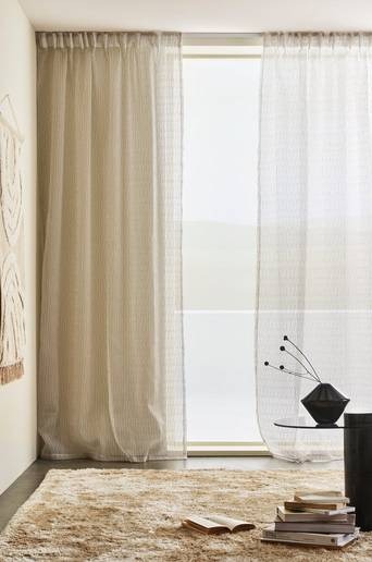 Två gardinlängder i transparent polyestertyg med mönster skapat av lite kraftigare tråd på i det ljusa tyget. Längderna har påsytt multifunktionsbandoch gardinen kan hängas upp med fingerkrokar, kanal samt dold hälla. Material: 100% polyester. Storlek: Bredd per gardinlängd 135 cm. Välj längd vid beställning. Skötselråd: Tvätt 40°. Krympning max 3 %. Tips/råd: STRILA släpper igenom ljuset och ger samtidigt visst insynsskydd. Det är en härlig kombination som passar i många rum, ljusinsläpp utan direkt insyn.