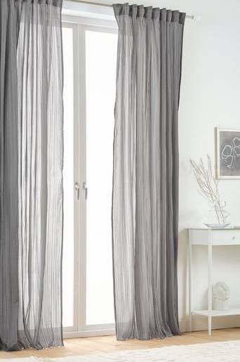 Två gardinlängder i plisserad polyester och med påsytt multifunktionsband. Det skira tyget har små lagda veck som gör längderna speciella. Nederkanten har en tät overlocksöm så att plisseringen får ett smidigt avslut och vecken faller fint. Gardinen kan hängas upp med fingerkrokar, kanal samt dold hälla. Material: 100% polyester. Storlek: Bredd per gardinlängd 135 cm. Välj längd vid beställning. Skötselråd: Kemtvätt. Tips/råd: Med nya gardiner och vacker dekoration på fönsterbrädan får du ett nytt, fräscht fönster.