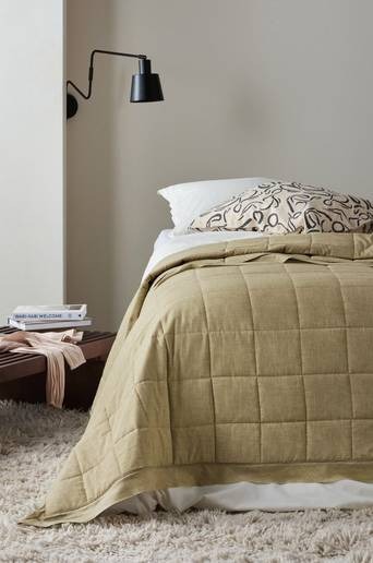 Överkast för enkelsäng. SENTE är av bomull och polyester och har garnfärgat utseende som ger en mjuk och hemtrevlig känsla. Överkastet är rutquiltat med smidig fyllning av polyester. En tunn, rå kant runt om är detaljen som ger överkastet speciell inramning. Kuddfodral medföljer ej, köps separat. Material: 80% polyester och 20% bomull, fyllning 100% polyester. Storlek: 180×260 cm. Skötselråd: Tvätt 40°. Krympning max 3%. Tips/råd: Matcha med SENTE kuddfodral och få en enhetlig bäddning.