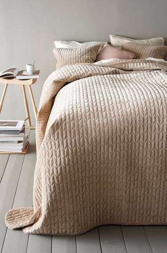 Överkast i quiltad sammet med dekorativa sömmar och piping runt om. Storlek: 180×260 cm. Material: 100% polyester. Fyllning 100% polyester. Skötselråd: Skontvätt 30 grader. Tips/råd: Om du vill ha flera delar i samma serie finns TILY som bäddpaket.
