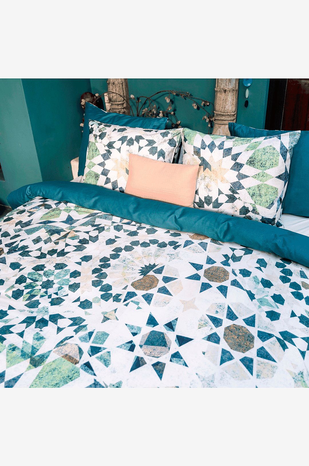 Påslakanet faiz är inspirerat av hantverket med marockanska kakelplattor. Påslakanet faiz har fantastiska detaljer. Trycket ligger som en mosaik över påslakanet. Baksidan av påslakanet är enfärgad. Påslakanet faiz är tillverkat av 100% ren organisk bomullssatin, gots- cerifierat. Supermjukt, med en lyxig glans. Bäddset bestående av två örngott och ett påslakan med en trådtäthet på 200tc.