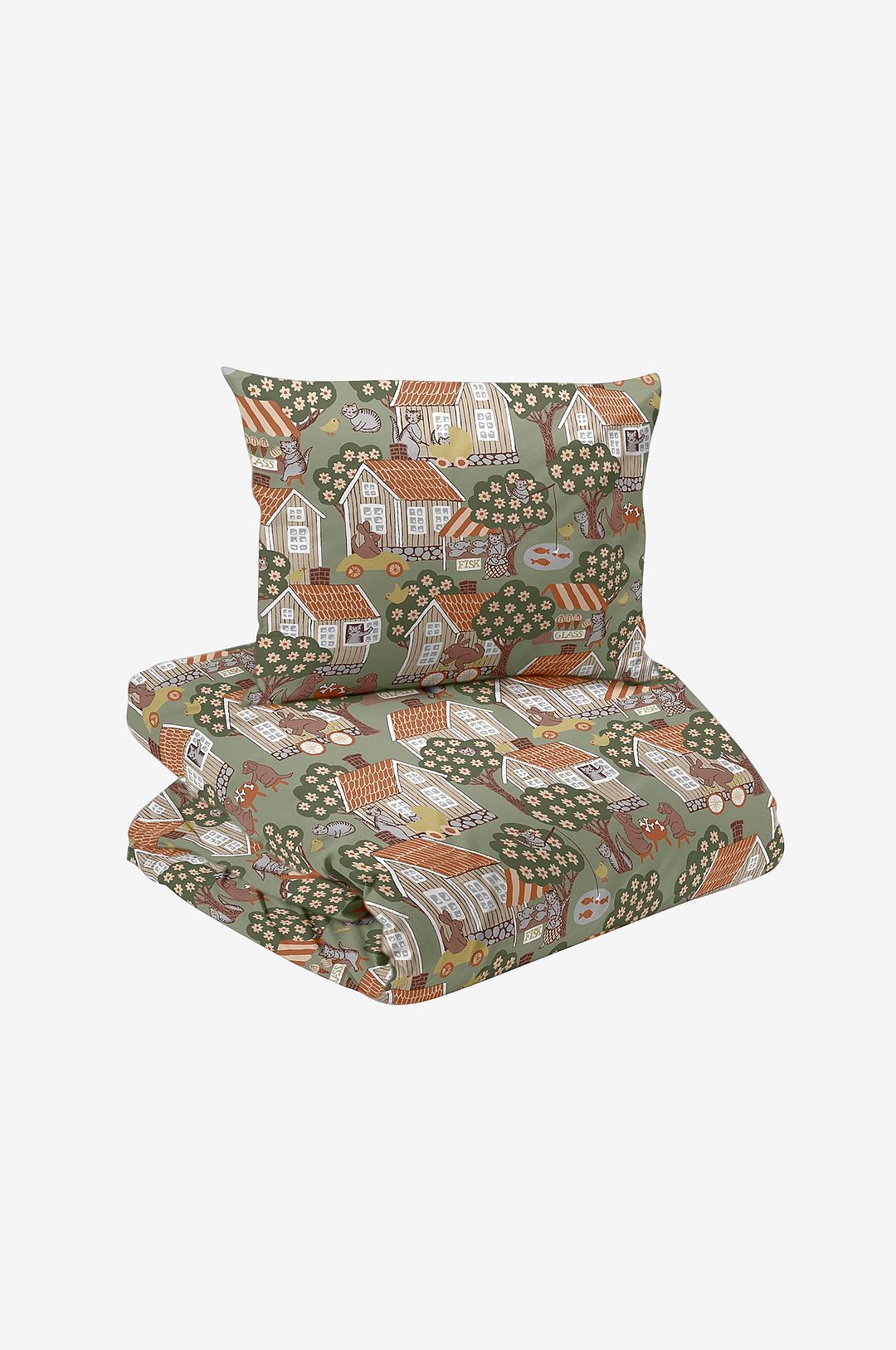 Ett charmigt bäddset för spjälsäng med ett mönster skapat av en svensk designer. Trådantal 104.