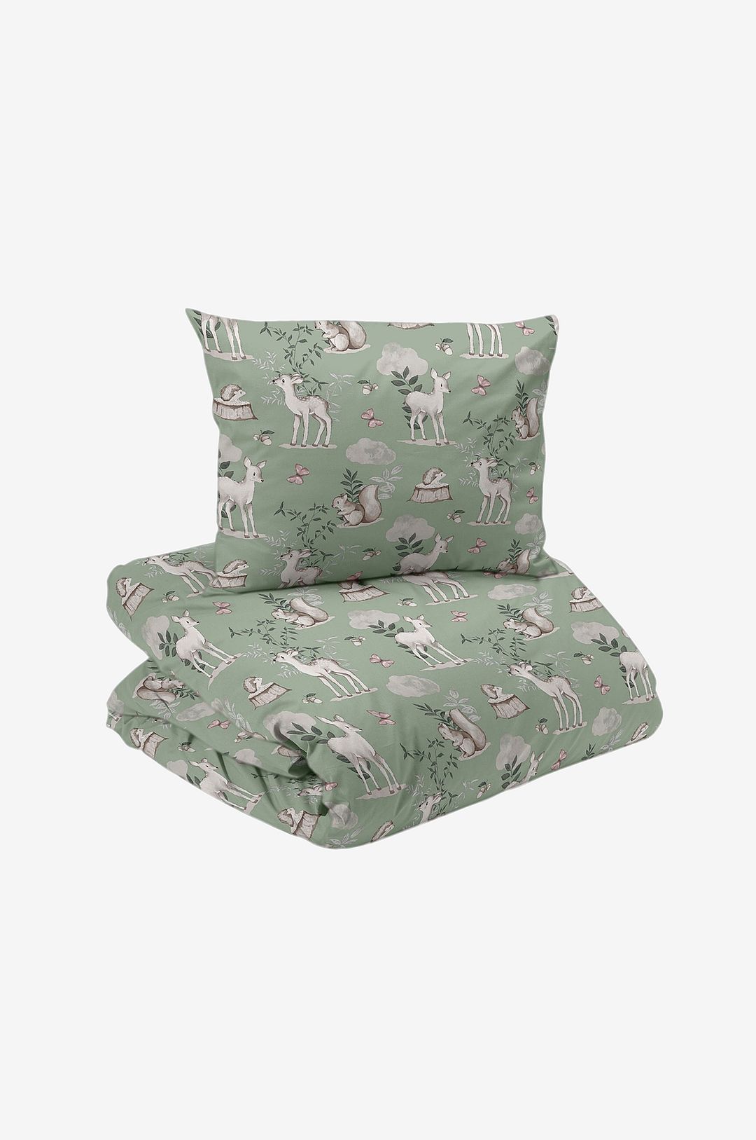 Bäddset med mjuka naturinspirerade motiv som skapar en harmonisk atmosfär i barnrummet. Trådantal 120.