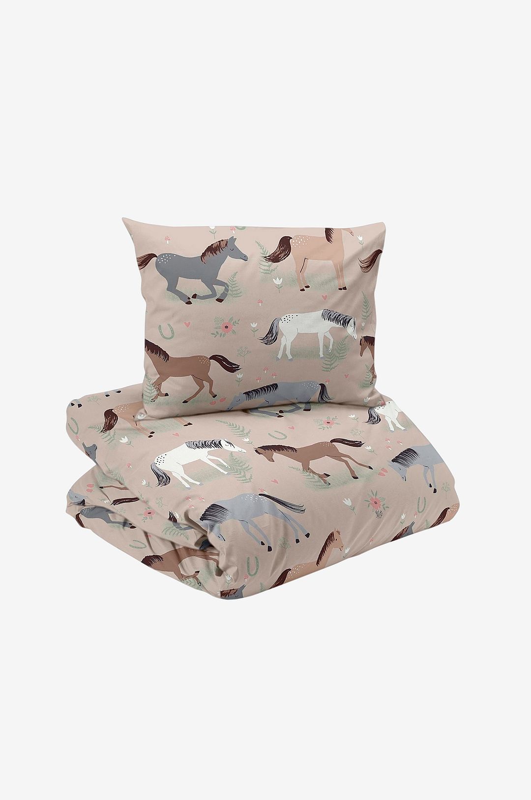 Sött 2-delat sängklädesset med hästmotiv, tillverkat av 100 % BCI-bomull. Trådtäthet 104.