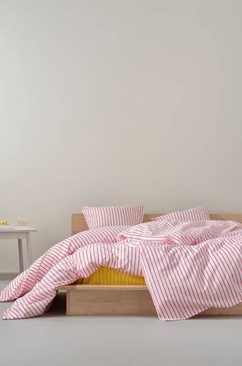 SIMA bäddset tillverkat av ekologisk bomull. Tryckta ränder i krispiga färger. Praktiska handhål för täcket. Förvandla ditt sovrum till en vilsam plats. Licensnummer & testinstitut: ETKO 00004150 ETKO. Produkten är certifierad med Global Organic Textile Standard (GOTS), vilket innebär att den innehåller ekologiskt material som är odlat utan kemiska bekämpningsmedel, konstgödsel och genmodifierade grödor (GMO). Produkten uppfyller GOTS sociala och miljömässiga krav på ansvarsfull tillverkning från odling till slutprodukt. Material: 100% Bomull. Set i 2 delar: 1 påslakan 150×210 cm, 1 örngott 60×50 cm. Öppning i övre hörnen på påslakanet, som underlättar att trä påslakanet över täcket. Trådtäthetför 144 TC. (Trådantalet avser antalet trådar, trådantal, per kvadratcentimeter i ett tyg. Ju högre trådantal, desto högre kvalitet). Maskintvätt 60°. Använd inte blekmedel. Torktumla i normal temperatur. Strykning hög temp. Högsta temp. 200°C. Kemtvätt (endast petroleum-lösningsmedel). Krympning max 5 %. Tvättas före användning. Tvättas med avigsidan ut.