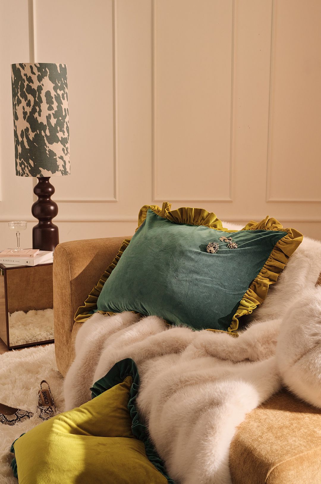 · Kuddfodral i sammet · Dragkedja på baksidan · 8 cm dubbel volang runt om