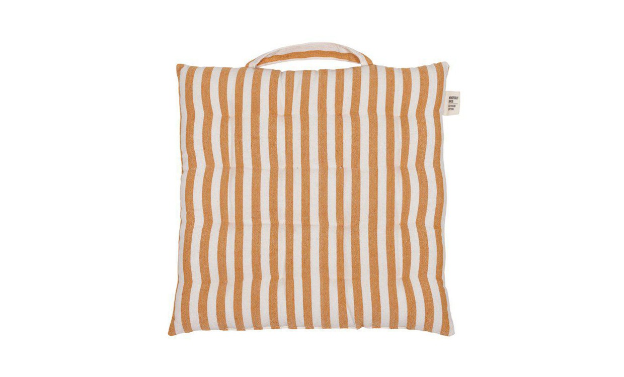 Selma är en randig sittdyna som är tillverkad av återvunnen bomull och återvunnen polyester, vilket gör den till ett hållbart och miljövänligt val. Den mjuka stoppningen ger en bekväm sittupplevelse samtidigt som materialblandningen bidrar till god slitstyrka. Dynan är försedd med ett praktiskt handtag som gör den enkel att bära med sig och flytta mellan olika sittplatser, både inomhus och utomhus.Obs! Dynan säljs i 2-pack, priset är angivet per styck.Design & egenskaperRandig sittdyna i vit och orange ton.Mått: 38 x 38 cm.Material & skötselTillverkad i 70 % återvunnen bomull, 30 % återvunnen polyester.Tål ej maskintvätt eller torktumling.