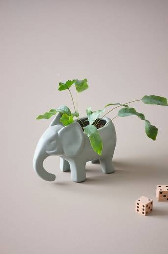 Kruka av keramik. Krukan har formen av en elefant, söt och liten, passar pefekt i barnrummet. Ut- och insidan är glaserad i samma färg. Tänk på att keramik kan släppa igenom fukt. Material: Keramik. Storlek: Höjd 11,6 cm, bredd 16 cm, djup 8,3 cm. Tips/råd: En liten elefantparad med små gröna växter piggar upp fönsterbrädan.