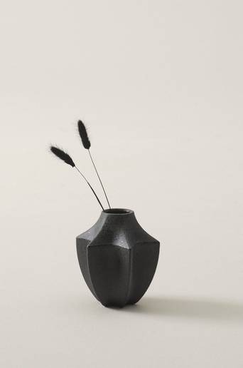 Stjärnformad vas av stengods med matt mörkgrå yta som har blankt stänkmönster. Vasens läckra form är lika dekorativ vare sig du har blommor och kvistar i den eller om den är tom. Stengods kan släppa igenom fukt. Material: Stengods. Storlek: Höjd 17,5 cm, ø 16 cm. Skötselråd: Handdisk.