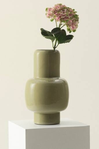 Dekorationsvas av järn med emaljfinish som ger glans och djup till färgen. Formen är stilren och elegant. Matt svart insida och tygklädd botten på utsidan. Vasen tål vatten, men vatten kan över tid göra att den rostar. Materiał: Järn. Storlek: Höjd 33,5 cm, ø 20,5 cm. Skötselråd: Handdisk. Tips/råd: Dekorationsvasen BIRK gör sig fint tillsammans med LOVIS och RONJA. Vaserna matchar snyggt tillsammans, i färg, form och storlek.