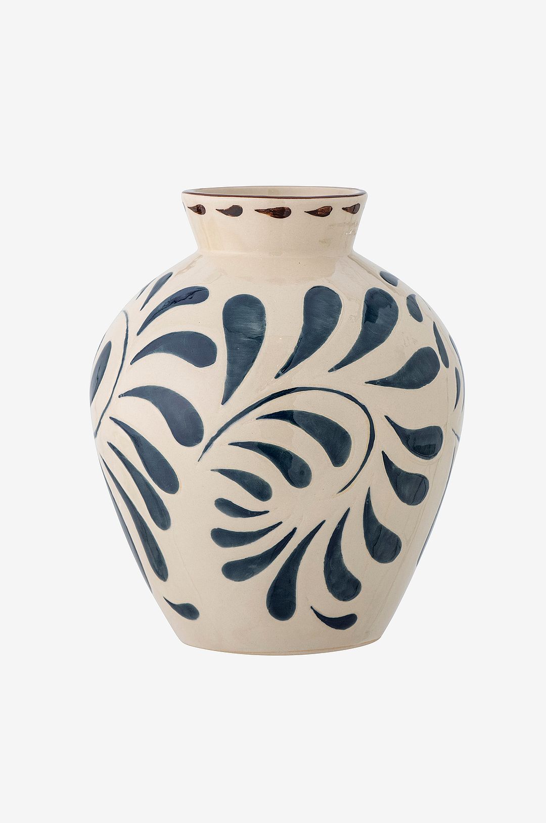 Handmålade detaljer pryder heikki -vasen från bloomingville och symboliserar perfektionen i det handgjorda och skönheten i hur variationer i färger, former och material skapar unikhet. Vasen är vackert gjord av stengods med ett härligt präglat blått mönster. Eftersom vasen är handdekorerad kan variationer i färg och mönster förekomma. D20xh24 cm