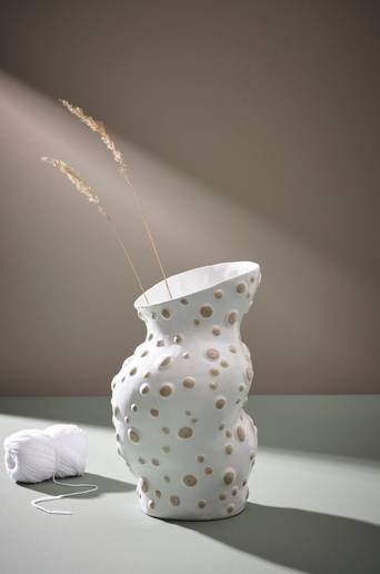 Dekorationsvas av keramik. Vasen är handgjord och har en oregelbunden form och ett dekorativt prickigt mönster. Även insidan är glaserad. Viss avvikelse kan förekomma eftersom vasen är handgjord. Keramik kan släppa igenom fukt. Material: Keramik. Storlek: Höjd 33,5 cm, bredd 22,5 cm, djup 21 cm.