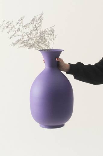 Vas av järn med vacker, djup lila färg som är matt. Vasen har tidlös, mjukt rundad form och är vacker både med blommor i och utan. Var medveten om att järn rostar över tid och om ytan skadas. Material: Järn. Storlek: Höjd 45 cm, ø 25 cm. Skötselråd. Torkas av med lätt fuktad trasa. Tips/råd: Fånga upp den lila färgen som kraftfull accentfärg i rummet.