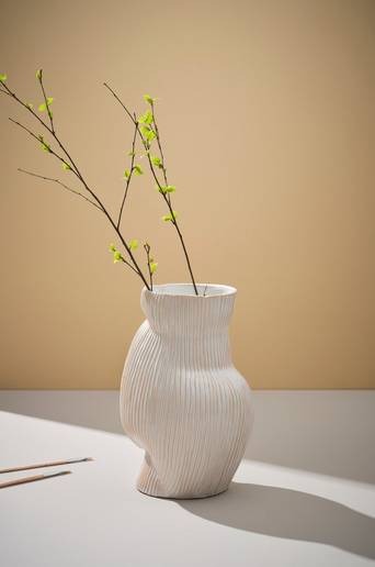 Handgjord dekorationsvas av keramik. En stilren vas med spännande form och räfflad yta. Även insidan är glaserad. Viss avvikelse kan förekomma eftersom vasen är handgjord. Keramik kan släppa igenom fukt. Material: Keramik. Storlek: Höjd 33,5 cm, bredd 23 cm, djup 20 cm.
