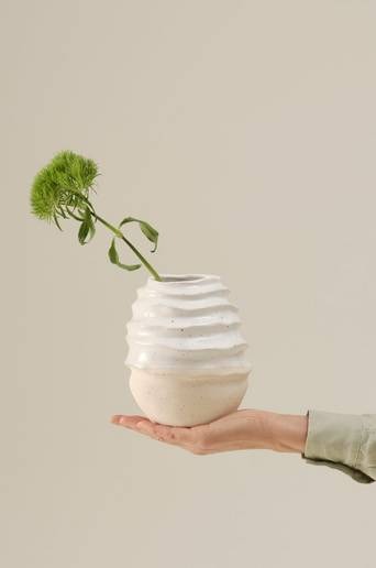 Keramikvas i mjuk och oregelbunden form med delad glasyr. Vasen har glaserats för hand och är melerad i ljus, blank färg upptill, nedtill har den stenfinish. Även insidan är glaserad. Det fina hantverket gör varje vas unik. Keramik kan släppa igenom fukt. Material: Keramik. Storlek: Höjd 16,5 cm, ø 14 cm, öppning ø 7 cm. Skötselråd: Handdisk. Tips/råd: RITA är en vacker dekoration även utan blommor eller kvistar.