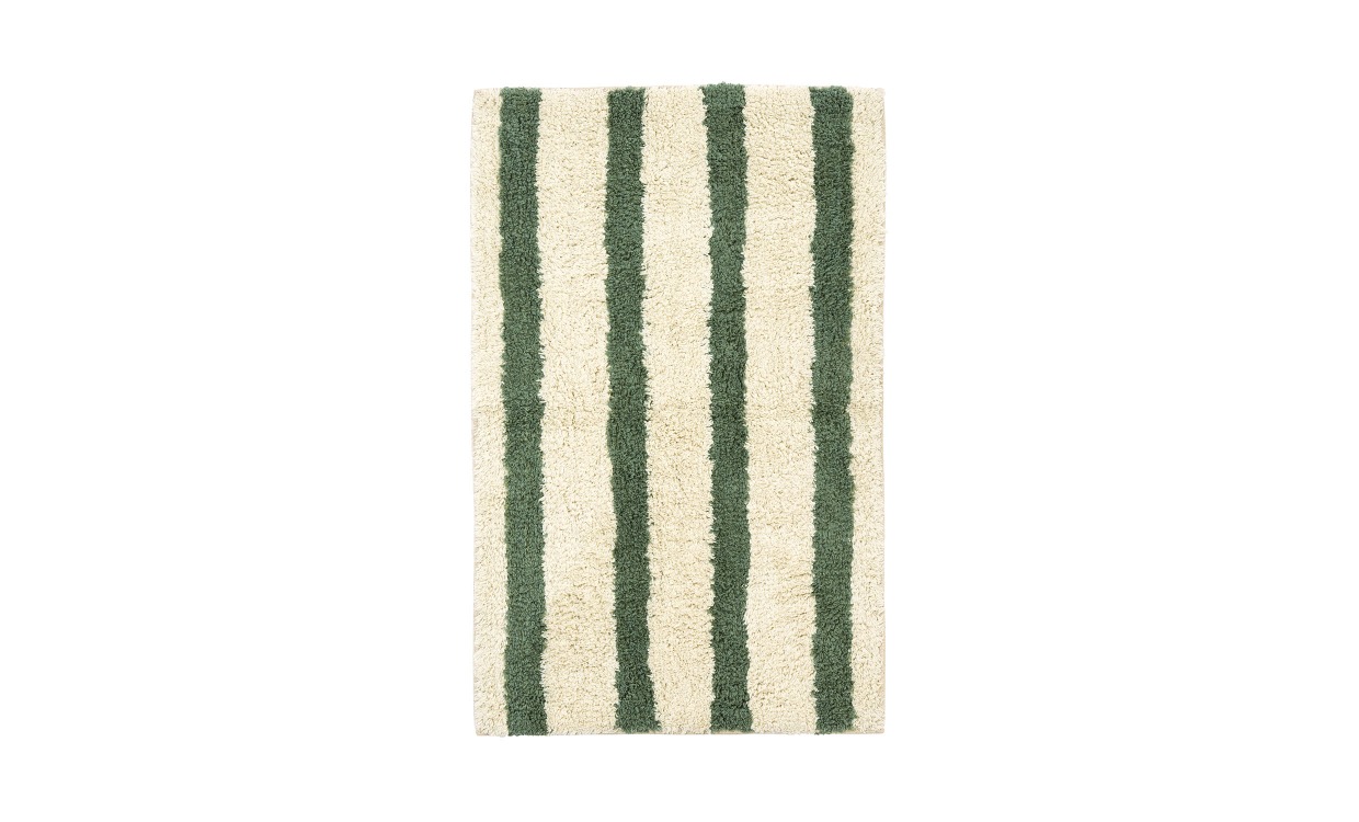 Denna randiga badrumsmatta i grönt och offwhite ger badrummet ett fräscht och somrigt uttryck. Den tuftade designen i mjuk, fluffig bomull känns behaglig under fötterna, medan baksidan i halkskyddande latex håller mattan stadigt på plats. En praktisk och stilren detalj som är anpassad för daglig användning.Design & egenskaperRandig badrumsmatta från Madam Stoltz.Mått: 50 x 80 cm.Vikt: 0.65 kg.Material & skötselTillverkad i mjuk bomull. Maskintvättas i 30 °C.Undvik blekmedel och sköljmedel för att behålla bomullens absorptionsförmåga och fluffighet.Skaka och vädra regelbundet för att ta bort damm och förlänga livslängden på latexunderlaget.