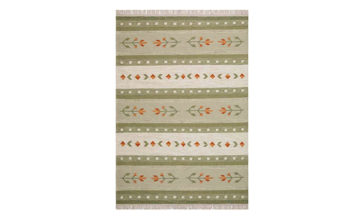 FANNY är en handvävd matta med röllakanteknik, den har röllakansmönster med ränder som pryds av tulpan rader. Eftersom den är gjord av ull är den även lätt smutsavvisande, man kan alltså enkelt torka bort mindre fläckarr med en fuktig handduk och mattan är väldigt tålig. Mattans avslut är klädd med en bomulls frans längs med kortsidorna. Den gör sig precis lika bra i läshörnan som under matbordet.Varje matta blir unik, eftersom att alla mattor har handvävts så kan det variera något mellan varje exemplar.Design & egenskaper80% Ull, 20% BomullHandvävd Ca 10 mm tjockMaterial & skötselRengör fläckar med handduk eller mjuk borste, lite vatten och såpa. För rengöring utav hela mattan rekommenderas fackmässig tvätt.Eftersom en ny ullmatta har ett överskott utav mattludd så är det bra att dammsuga den regelbundet.