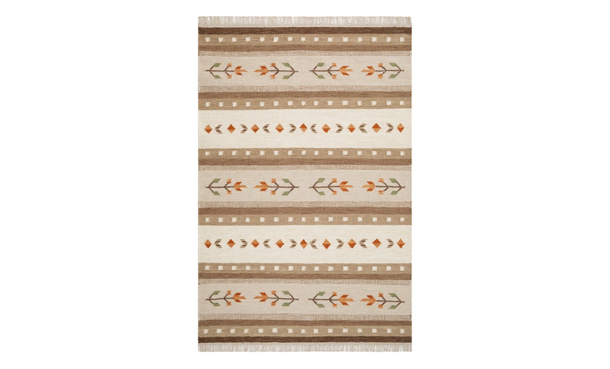 FANNY är en handvävd matta med röllakanteknik, den har röllakansmönster med ränder som pryds av tulpan rader. Eftersom den är gjord av ull är den även lätt smutsavvisande, man kan alltså enkelt torka bort mindre fläckarr med en fuktig handduk och mattan är väldigt tålig. Mattans avslut är klädd med en bomulls frans längs med kortsidorna. Den gör sig precis lika bra i läshörnan som under matbordet.Varje matta blir unik, eftersom att alla mattor har handvävts så kan det variera något mellan varje exemplar.Design & egenskaper80% Ull, 20% BomullHandvävd Ca 10 mm tjockMaterial & skötselRengör fläckar med handduk eller mjuk borste, lite vatten och såpa. För rengöring utav hela mattan rekommenderas fackmässig tvätt.Eftersom en ny ullmatta har ett överskott utav mattludd så är det bra att dammsuga den regelbundet.