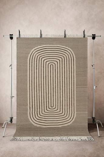 Handvävd kelimmatta av ull och bomull. Kelimmattan är en slätvävd matta utan lugg. AMOT är tvåfärgad med geometriskt randmönster i kontrasterande färger. Tack vare vävtekniken är mönstret likadant på båda sidor av mattan. Kelimmattor vävs ofta i naturliga material och AMOT är av ull och bomull. Ull som dominerar är ett praktiskt val då ullen är naturligt smutsavvisande. Det kontrastrika mönstret är också tacksamt då det kan dölja smulor och spill, fläckar syns mindre. AMOT är en matta som passar lika bra under matbordet som i vardagsrummet. Mattan är dessutom enkel att skaka ur tack vare den smidiga kvalitén. Mattan har långa fransar längs kortsidorna. Franslängd 10 cm. Tjocklek 0,5-0,6 cm. 1200-1400 g/m². Material: 76% ull och 24% bomull. Storlek: 200×300 cm. Skötselråd: Dammsug regelbundet med munstycke utan borst. Ullmattor är naturligt smutsavvisande tack vare ullens fetter. Smuts lägger sig på ytan och dammsugas upp eller vädras bort. Mindre fläckar kan baddas med fuktig trasa med ljummet vatten. Lämna in för fackmässig tvätt. Tips/råd: Använd gärna STOPP halkskydd för att minska halkrisken och att mattan glider. Det skyddar dessutom både mattan och golvet. Vrid mattan ibland för ett jämnt slitage. Stark sol kan göra att färgerna bleks.