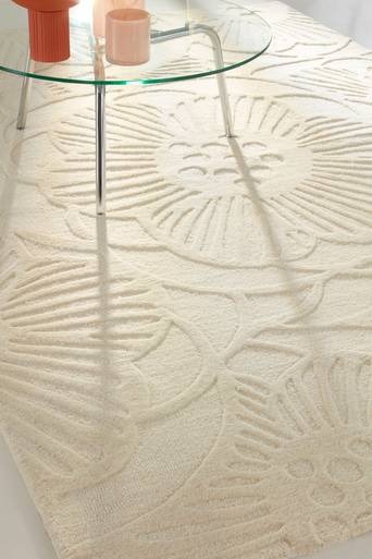 Handtuftad ullmatta som är enfärgad och har diskret blommönster som skapats av vävtekniken i kombination med varierande längd på luggen. Mattan har tät lugg som är mjuk och varm att gå på. Ull ger en naturligt varm och praktiskt smutsavvisande matta. Lugghöjd 0,8-1 cm. Tjocklek 1,6 to 2,5 cm. 3500-3700 g/m². Material: 100% ull. Storlek: 160×230 cm. Skötselråd: Dammsug mattan regelbundet utan borste eller med ett roterande munstycke. Lämna in till professionellt tvätteri för mattor. Ullmattor är naturligt smutsavvisande tack vare ullens fetter. Smuts lägger sig på ytan och dammsugas upp eller vädras bort. Mindre fläckar kan baddas med fuktig trasa med ljummet vatten. Tips/råd: Vrid mattan ibland för ett jämnt slitage.
