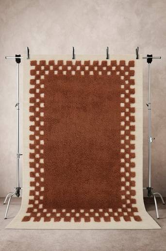 Handtuftad ullmatta med rutmönster som skapas av olika vävteknik, lugglängd och färg på garnet. Det ljusa garnet som skapar ramen runt om har vävts i öglor medan den mörkare luggen är klippt och lite längre. Ull ger en naturligt varm och praktiskt smutsavvisande matta. Lugghöjd öglor 1-1,1 cm, klippt lugg 3-3,2 cm. Tjocklek 3,2-3,4 cm. 3800-4000 g/m². Material: 100% ull. Storlek: 200×300 cm. Skötselråd: Dammsug mattan regelbundet utan borste eller med ett roterande munstycke. Lämna in till professionellt tvätteri för mattor. Ullmattor är naturligt smutsavvisande tack vare ullens fetter. Smuts lägger sig på ytan och dammsugas upp eller vädras bort. Mindre fläckar kan baddas med fuktig trasa med ljummet vatten. Tips/råd: Vrid mattan ibland för ett jämnt slitage. Stark sol kan göra att färgerna bleks.