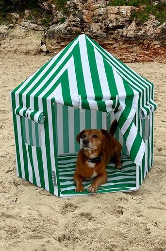 Sexkantigt djurtält med randig tältduk av vattenavvisande polyester och tältpinnar av plast. Tältet ger en skuggig, torr och vindskyddad plats att vila på i trädgården eller på balkongen. Tältet har öppningar så du kan låta luften strömma igenom om det blir för varmt. Det randiga mönstret är digitaltryckt vilket ger klara distinkta färger. Tältet kan användas både inne och ute. Tänk på att inte lämna tältet ute när du inte använder det. Förankra det gärna i marken om det blåser. Material: Tältduk av polyester. Tältpinnar av plast. Storlek: Höjd 85 cm. Varje sida är 38 cm. Bredd öppning 38 cm. Innermått ø 64-72 cm. Skötselråd: Tältduk handtvätt 30°. Pinnarna torkas av med lätt fuktad trasa. Tips/råd: Ska ni på utflykt och du är rädd för gassande sol är tältet perfekt att ta med som skydd för exempelvis din hund.