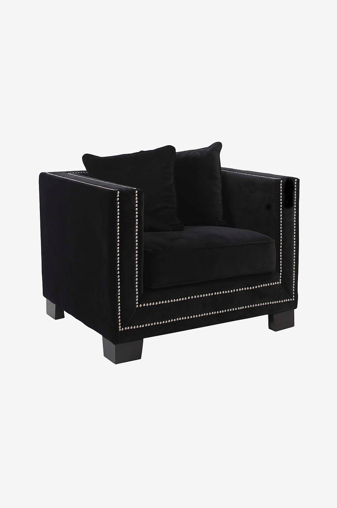 Fåtölj i velour med blanka dekorationsspikar. Lackerade träben. 2 st kuddar ingår. Mått på armstöd: Höjd 29 cm, bredd 15 cm. Sittdynans tjocklek: 15 cm. Frihöjd under möbel: 10 cm