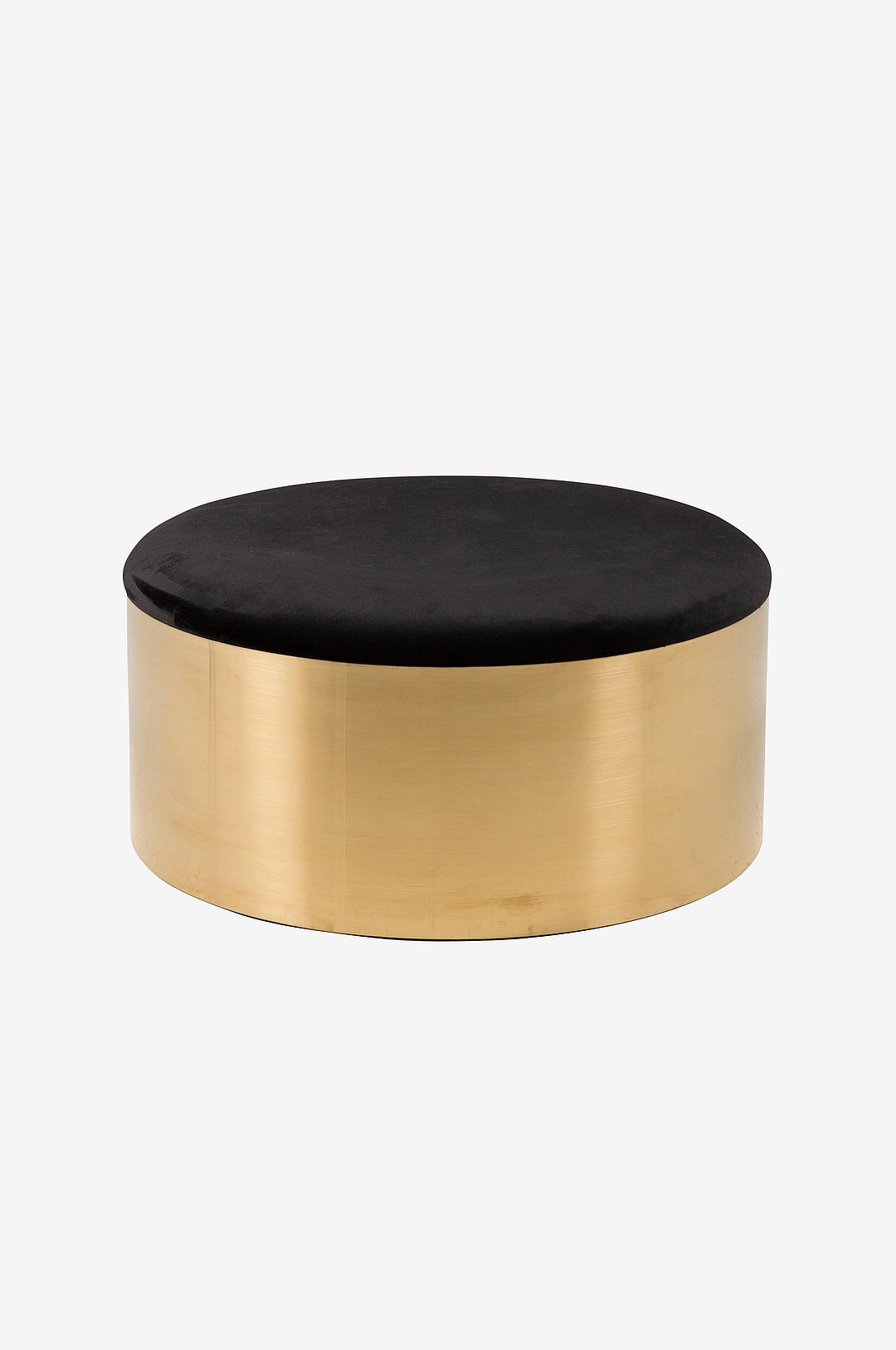 Furniture Fashion Puff med en rund form i sammet och ram i trä samt borstad mässing. Puffen kräver enklare montering.