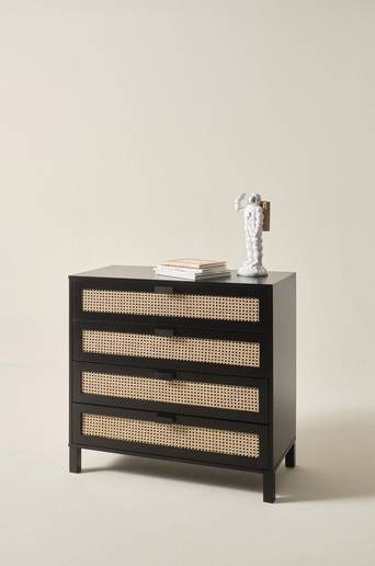 Byrå i FSC-certifierat furuträ och MDF. De fyra lådorna har fin rotting infälld i fronten. Varje låda har ett rejält handtag som är diskret och smälter in fint, i samma färg som byrån. Byrån har målats med vattenbaserad färg, rottingen är naturfärgad. En byrå är en oerhört praktisk möbel som rymmer mycket och är lätt att hålla ordning i. Väggfäste ingår. Viss montering krävs. Monteringsanvisning medföljer. Produkten är certifierad med FSC vilket innebär att den består av trä som är avverkat från ett ansvarsfullt skogsbruk som tar hänsyn till människor och miljö. Licensnummer & testinstitut: FSC-C166447 SGS. Material: Furu, rotting och MDF. Storlek: Höjd 84,2 cm, bredd 90 cm, djup 42 cm. Frihöjd under möbel: 11 cm. Maxvikt: 10 kg/låda, 100 kg på toppen. Skötselråd: Torkas av med lätt fuktad trasa. Tips/råd: Vägghyllor ovanför byrån är praktiskt och spar plats i ett lite mindre hem.