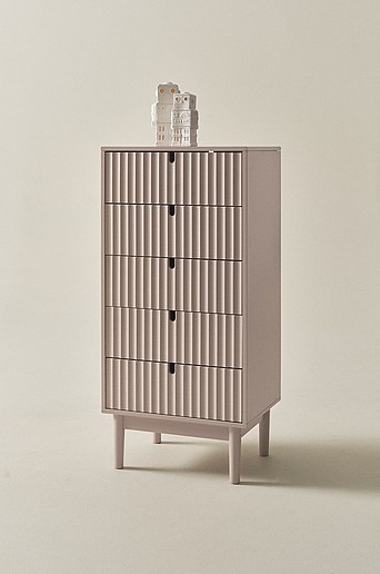 TOULUSE är en fin möbelserie av av FSC-märkt furu och MDF. Signifikativt för serien är den vågformade fronten som blir en fin detalj och samtidigt ger en liten touch av retro. Benen är runda och raka vilket förstärker nostalgikänslan. Ytan har behandlats med vattenbaserad färg som ger en mjuk, behaglig yta. Viss montering krävs. Monteringsanvisning medföljer. Byrån har fem lådor med ett urfräst hål i överkant som gör det enkelt att öppna dem. Produkten är certifierad med FSC vilket innebär att den består av trä som är avverkat från ett ansvarsfullt skogsbruk som tar hänsyn till människor och miljö. Licensnummer & testinstitut: SAI-COC-004967 SAI Global. Material: Furu och MDF. Storlek: Höjd 115 cm, bredd 55 cm, djup 40 cm. Frihöjd under möbel: 14 cm. Maxvikt: 35 kg. Skötselråd: Torkas av med lätt fuktad trasa. Tips/råd: Inred en underbart mysig barnkammare med flera delar ur serien TOULUSE.