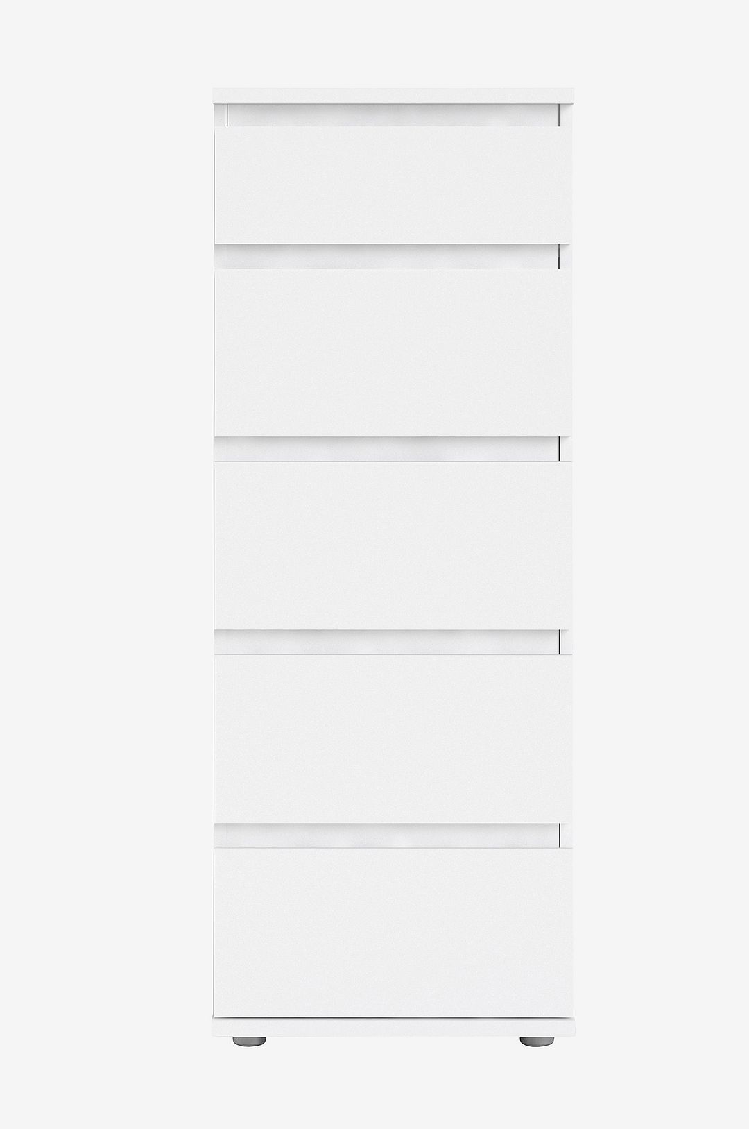 Byrå med fem lådor från Tvilum som passar i alla rum och är perfekt i mindre utrymmen. Den enkla, minimalistiska designen ger en tidlös känsla som kan kombineras med alla inredningsstilar. Byrå med fem lådor utan handtag, som ger gott om förvaringsplats utan att ta upp för mycket plats, och blir en viktig möbel i ditt sovrum. Folieytan bleknar inte, är lätt att rengöra och ger en ren, enkel design med mjuka kanter. Tillverkad i Danmark.