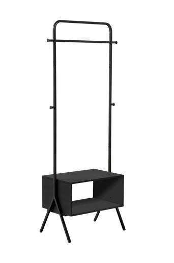 Klädhängare med stomme av stål med en praktisk, svartmålad hylla i botten. En stilren klädhängare som gör det enkelt och bekvämt att organisera dina kläder och skor. Material: Stål. Storlek: Höjd 180 cm, bredd 74 cm, djup 42 cm. Skötselråd: Torkas av med lätt fuktad trasa.