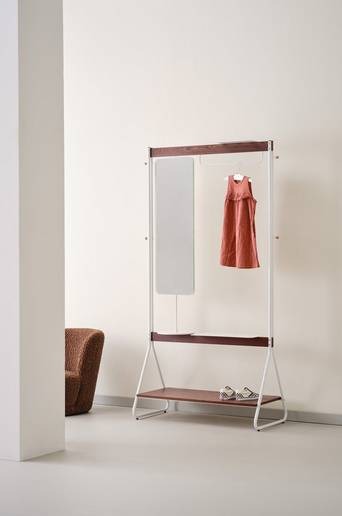 Klädhängare för det moderna barnrummet. Den har en stång, en stor hylla och en spegel. Mindre hyllor för småsaker. Tillverkad av järn med matt vit pulverlackering. Hyllorna är tillverkade av MDF med brun askfanér. Max. lastvikt: nedersta hyllplanet 20 kg, mellan-/översta hyllplanet 5 kg, runt hyllplan 2 kg, knoppar 5 kg vardera. Måste monteras i vägg. Skruvar ingår ej. Stomme: Järn. Ytbehandling: pulverlackerad. Hyllplan: MDF. Ytbehandling: fanérad. Längd/Djup: 45.0 X Bredd: 91.0 X Höjd: 180.0 cm. Mått hyllplan: 86,6x40x1,5 cm. Mått stång: ø 2,5 cm. Mått spegel: 30×90 cm. Mått round shelf: ø 25 cm. Högsta tillåtna vikt på hyllplan: 40.0 kg. Fästs i väggen. Väggfäste inkluderad. Levereras omonterad. Monteringsanvisning medföljer. Skötselråd: Torkas av med lätt fuktad trasa. Tips/råd: Om du har ett känsligt golv rekommenderar vi att du sätter möbeltassar eller annat skydd på kontaktytorna mot golvet.