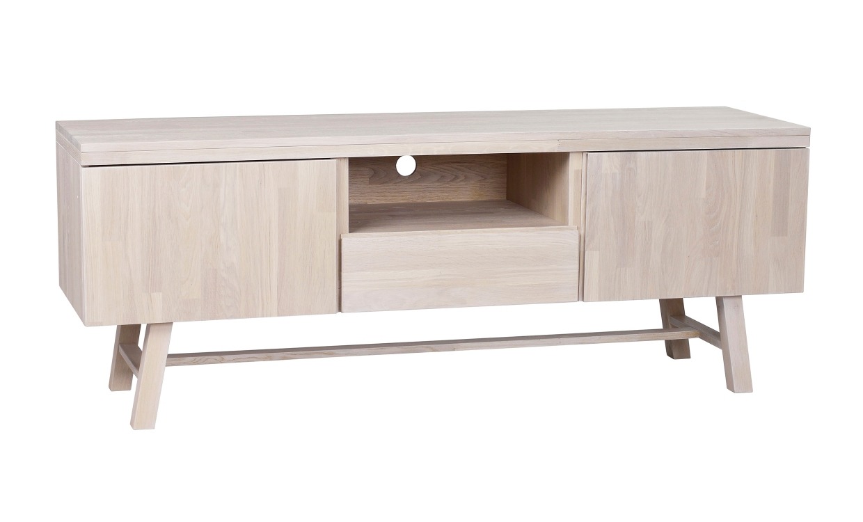Brooklyn är en TV-bänk i whitewash ek. Den härliga färgen med eken som lyser igenom gör det riktigt ombonat och mysigt i vardagsrummet. Här finns förvaringsmöjligheter och en smart utborrad utgång på baksidan för att dölja synliga sladdar. Design & egenskaperRobust och stilren TV-bänk med praktisk förvaring.Dörrar och lådor har så kallat soft close som innebär att de stängs mjukt och undviker onödigt slitage.Dörrarnas invändiga mått: 50x42x26 cmLådans invändiga mått: 44x42x4 cmÖppna fackets mått: 48x42x16 cmMått från golv till undersida: 23 cmMaterial & skötselTillverkad i massiv europeisk ek som behandlats med vitpigmenterad hårdvaxolja.Träet är FSC-märkt.Vid spill eller fläckar, använd en fuktig trasa och efterforska sedan med en torr trasa.Leverans & förpackningLevereras delvis monterad.Antal förpackningar: 1 st