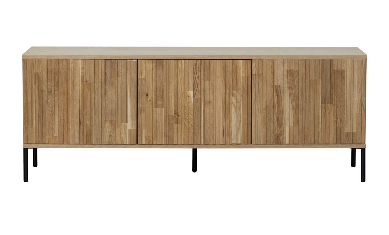 New Gravure är en vacker tv-bänk med enkla linjer och en stilren silhuett. Bänken har tre skåp med en invändig hylla i vardera vilket erbjuder en rymlig förvaring där det är enkelt att organisera. Dess nätta design gör att tv-bänken känns luftig trots den generösa förvaringen.Design & egenskaperVacker TV-bänk från WOOOD.Har måtten 56x150x44 cm.Varje plan har måtten 18x50x42 cm (6 stycken).Har hål på baksidan för sladdar.Material & skötselTillverkad av ekfanér. Ben av metall.Materialet är FSC-märkt.Ekfanér kan släppa eller ändra form vid kontakt med värme och/eller fukt. Var därför noggrann med att torka upp eventuellt spill så fort som möjligt.Trä är ett naturmaterial. Ådror och kvistar är en del av träets natur och träets färger och strukturer är naturliga egenskaper.Färgvariationer kan inte undvikas vid normal användning, men för att minimera missfärgning rekommenderar vi att du skyddar träet från direkt solljus.Torka av bänken med en torr eller lätt fuktig trasa.Maxvikt 50 kg.Leverans & förpackningLevereras omonterad.Antal förpackningar: 2 st.Förpackningsmått: 82x46x154 cm / 11x45x65 cmVikt: 19,5 kg / 14 kg.