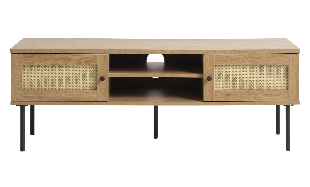 Nova är en modern och stilren TV-bänk med material som bidrar till en naturnära känsla. TV-bänken är tillverkat i ekmelamin och MDF med två stycken dörrar i polyrotting samt ben tillverkade i metall. Kombinera gärna med övriga möbler i samma serie.Design & egenskaperVacker TV-bänk med rottingdetaljer.Har dimensionerna: 120x43x40 cm.Hyllmått: B39,7 x D35,6 x H10,75 cm.Maxvikt per hyllplan: 10 kg.Material & skötselTillverkad i ekmelamin, MDF och polyrotting. Ben i metall.Trä är ett naturmaterial. Ådror och kvistar är en del av träets natur och träets färger och strukturer är naturliga egenskaper.Färgvariationer kan inte undvikas vid normal användning, men för att minimera missfärgning rekommenderar vi att du skyddar träet från direkt solljus.Eventuellt spill bör avlägsnas med en fuktig trasa.Leverans & förpackningLevereras omonterad.Antal förpackningar: 1 st.Vikt: 19 kg.