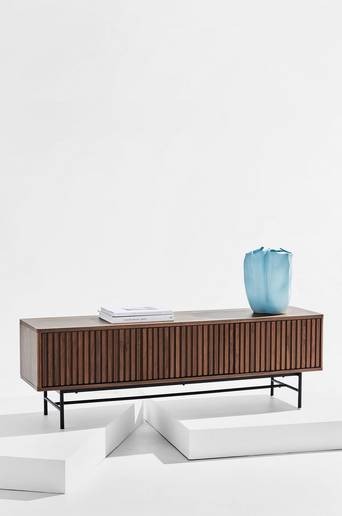 Gediget och välarbetat med tidlös design, så vill vi sammanfatta möbelkollektionen Rue. Tv-bänken har fin valötsfaner som ger klassisk attityd. De solida dörrarna har välformade, lodräta ribbor. Det ger dig helt dold förvaring samtidigt som ribborna ger en spännande yta som ändrar karaktär beroende på hur ljuset faller. Dörrarna är infällda under toppskivan och skåpet får med det en slank kontur. De har mjukstängande gångjärn och du öppnar dem smidigt med pushfunktion. Dörrar utan handtag förstärker den stilrena känslan. De främre hörnen är mjukt rundade. Invändigt är skåpet tredelat, en del bakom varje dörr. Runda hål i bakstycket förenklar hantering av sladdar. Stommen är tillverkad i FSC-certifierad MDF med fanerad valnöt. Valnötsfaneren är en naturlig produkt och skiljer sig åt i färg och ådringar mellan olika produkter. Skåpets underrede är av stål med matt pulverlackerad yta. Skåpet kommer med omonterade ben. Skruvar och monteringsanvisning för att skruva fast benen medföljer. Produkten innehåller trä som är avverkat från ett ansvarsfullt, kontrollerat och mer hållbart skogsbruk som tar hänsyn till människor och miljö. – MDF, valnötsfaner, stål – bredd 160 cm, djup 40 cm, höjd 51 cm, höjd från golv till skåp 20 cm, frihöjd under möbel 8 cm, ben ø 1,9 cm