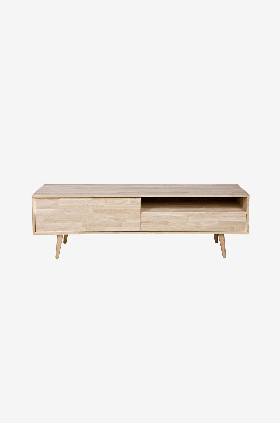 Tygo kommer i obehandlad ek. Denna väggenhet är utrustad med 1 låda, ett öppet fack och en fällbar dörr där det finns tillräckligt med utrymme att förvara mediautrustning, dvd-skivor och cd-skivor. Denna möbel har ett hål i bottenarket och i bakväggen så att ledningarna kan läggas genom den. En mediamöbel som är mycket mångsidig. Måtten på denna möbel är (bxhxd): 150x47x44 cm. För att skydda möblerna rekommenderas att behandla eken med möbelolja eller lack.