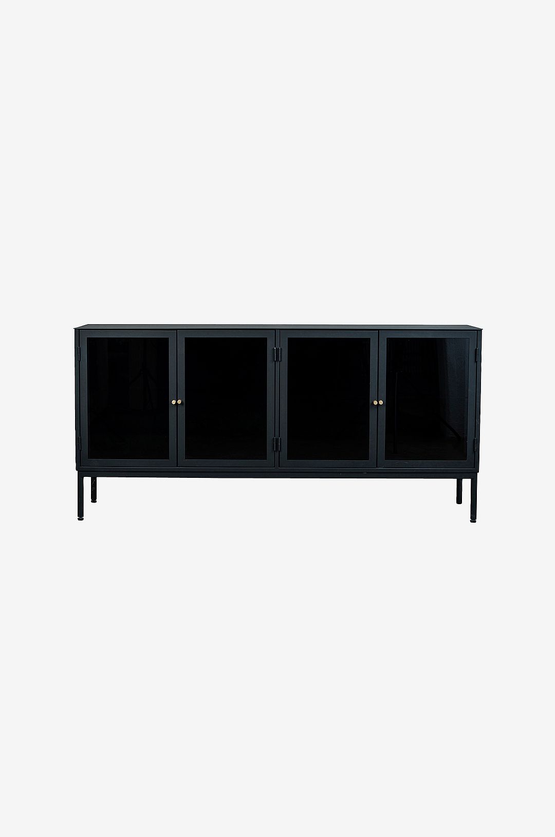 Elegant svart skåp med glasdörrar. Förvandla ditt hem med detta snygga och eleganta svarta skåp. Med sina glasdörrar och gyllene handtag är det en perfekt kombination av modern design och funktionalitet. Skåpet har tre rymliga hyllor som ger gott om utrymme för förvaring av dina favoritsaker.
