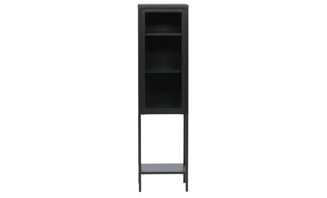 Bettina är ett praktiskt och stilfullt plåtskåp som passar perfekt i det moderna hemmet. Med sin industriella design i pulverlackerat stål och en glasdörr skapar skåpet en luftig och elegant känsla. De tre rymliga avlastningsytorna ger gott om förvaring för porslin, böcker eller dekorativa föremål. Bettina är lika funktionell som dekorativ och blir snabbt ett blickfång i rummet.Design & komfortPraktiskt och stilfullt plåtskåp, perfekt för det moderna hemmet.Har glasdörr för en ljus och luftig känsla.Mått: L 40,5 cm x B 35 cm x H 150 cmSkåpet klarar en maxvikt på 20 kg.Material & skötselTillverkat i pulverlackerat stål med glasdetaljer.Torka av med en mjuk fuktad trasa och milt såpvatten.Undvik att lämna vatten på ytan för att förhindra fläckar och rost.Vid svåra fläckar, använd en mjuk trasa fuktad i ren alkohol.