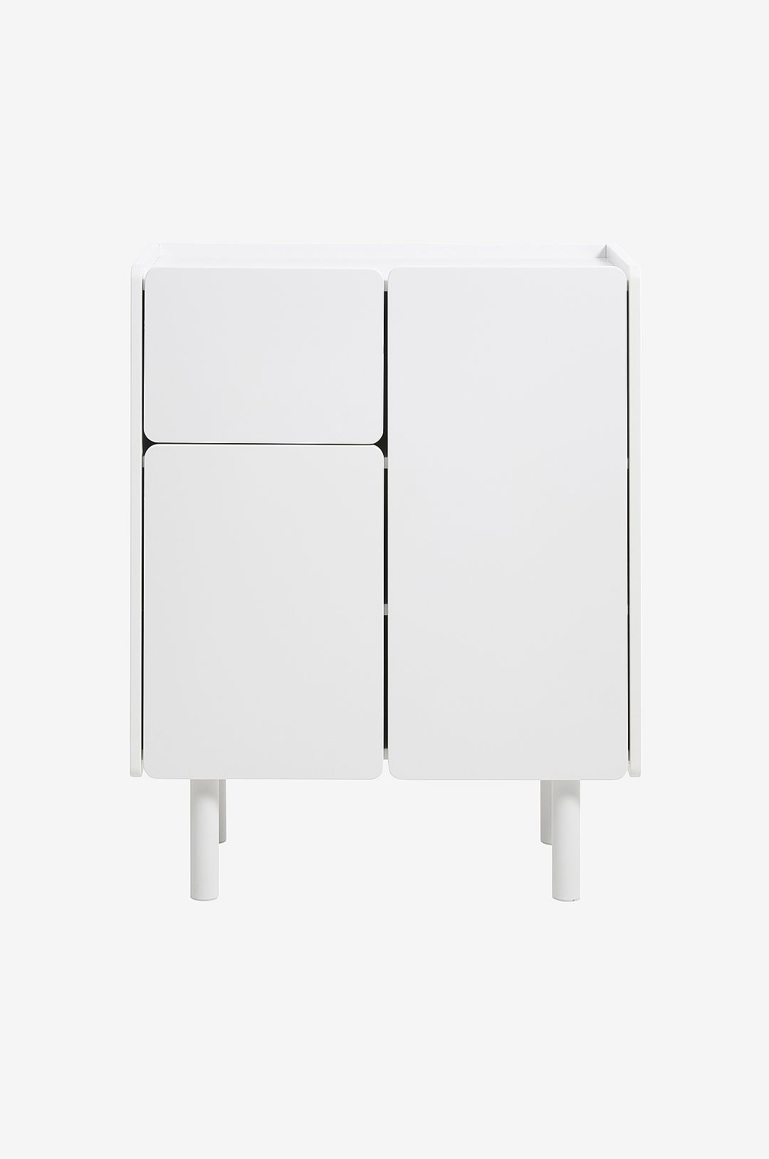 Denna cabinet har en elegant skandinavisk design med rena linjer och upphöjda ben. De två lådorna och det höga facket ger praktisk dold förvaring, vilket gör den till ett mångsidigt tillskott i vardagsrummet, sovrummet eller hallen