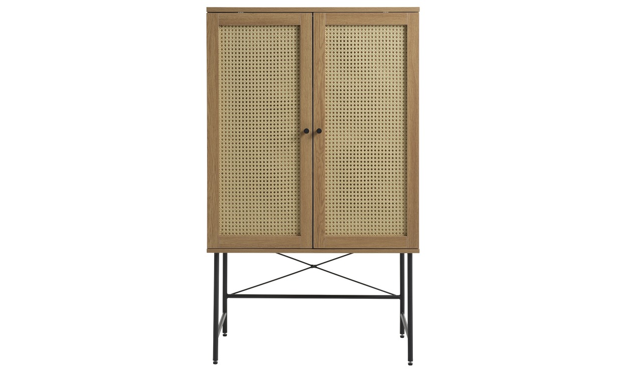 Nova är ett modernt och stilrent skåp med material som bidrar till en naturnära känsla. Skåpet är en unik men anpassningsbar möbel som passar lika bra i vardagsrummet som i sovrummet eller köket. Skåpet är tillverkat i ek och MDF med två stycken dörrar i polyrotting samt ben tillverkade i metall. Kombinera gärna med övriga möbler i samma serie.Design & egenskaperStilrent skåp med generös förvaring.Har dimensionerna 135x80x40cm.Har två stycken hyllplan med måtten 76,8×38 cm.Avstånd mellan hyllplan: 28,7 cm.Maxvikt per hyllplan: 10 kg.Material & skötselTillverkad i ek, MDF och polyrotting. Ben i metall.Trä är ett naturmaterial. Ådror och kvistar är en del av träets natur och träets färger och strukturer är naturliga egenskaper.Färgvariationer kan inte undvikas vid normal användning, men för att minimera missfärgning rekommenderar vi att du skyddar träet från direkt solljus.Eventuellt spill bör avlägsnas med en fuktig trasa.Leverans & förpackningLevereras omonterad.Antal förpackningar: 2 st.Vikt: 31 kg.