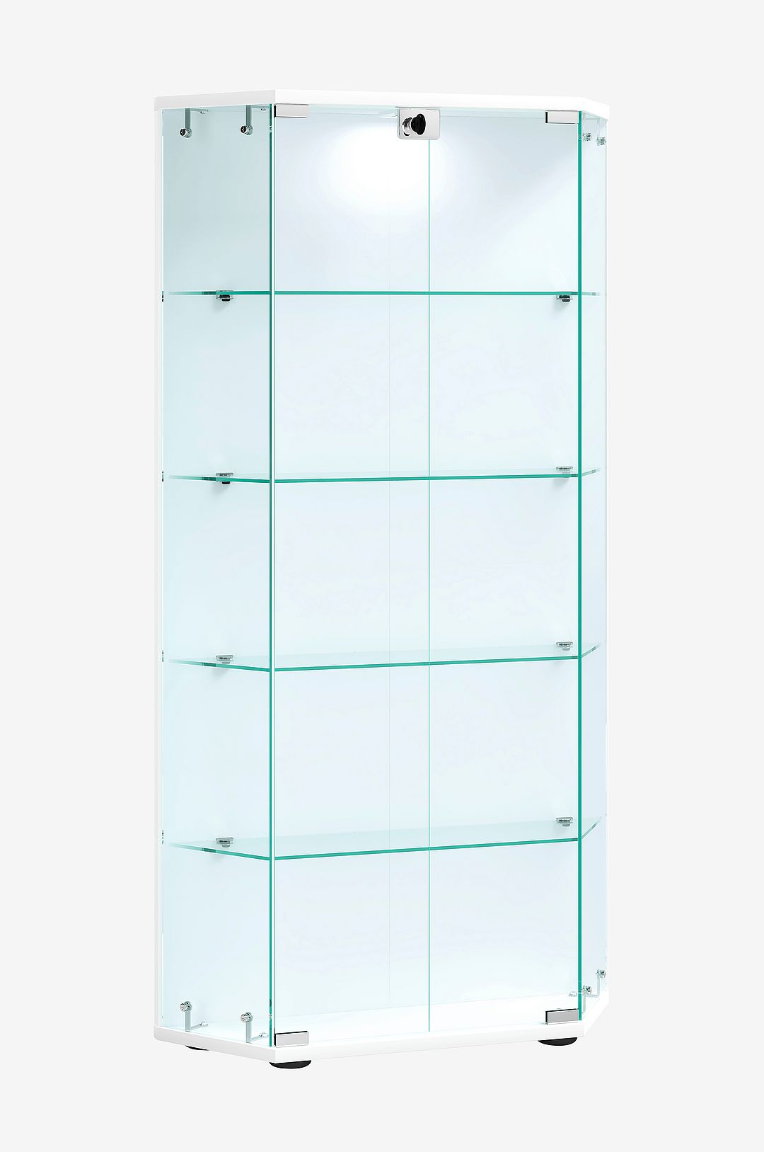 Höjdpunkter: – 4 hyllplan av glas – individuellt justerbara hyllor – vitrinskåp med två gångjärnsförsedda dörrar – låsbara med två nycklar – belysning finns som tillval – mått h. 114 x b. 83 x d. 17 cm vitrinskåpet är utformat som en trapets, vilket ger möbeln ett speciellt utseende. glashyllorna är justerbara och kan därför när som helst anpassas till personliga behov. Den vackra möbeln avrundas med två smidigt löpande gångjärnsdörrar. Designern har lyckats skapa ett utseende som gör glasskåpet till ett blickfång i nästan alla rum. Vitrinskåpet kan kompletteras med led-belysningen ”vcm leuchto”.