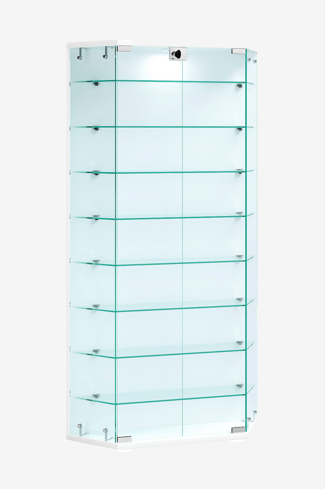 Höjdpunkter: – 8 hyllplan av glas – vitrinskåp med två gångjärnsförsedda dörrar – låsbara med två nycklar – belysning finns som tillval – mått: h. 114 x b. 83 x d. 17 cm Vitrinskåpet har en trapetsformad design som ger ett distinkt utseende. De justerbara glashyllorna kan flyttas när som helst för att passa individuella behov. Två smidiga gångjärnsdörrar kompletterar denna vackra möbel. Formgivaren har skapat en estetik som gör glasskåpet till ett riktigt blickfång i nästan alla rum.
