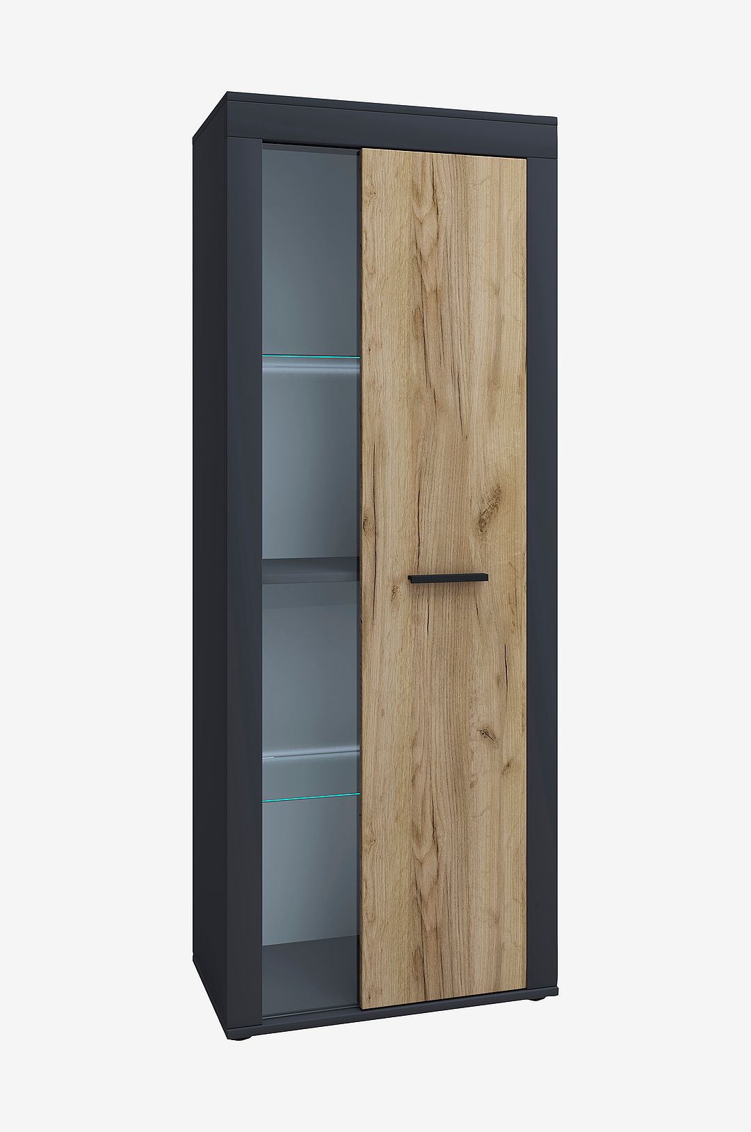 Höjdpunkter: – tidlös design – elegant gångjärnsdörr med trä och glas – breda gavelfronter – tre justerbara hyllplan för fyra fack – beslag av högkvalitativ metall – mått ca H. 159 x B. 60 x D. 35 cm den puristiska garderoben ”usilo” övertygar med gott om förvaringsutrymme och breda gavelfronter. Den stilrena designen passar i alla miljöer och ger gott om utrymme för tydlig organisering. Skåpet är lika användbart i vardagsrummet som i andra rum. Två gångjärnsdörrar och fyra fack erbjuder gott om organiserat förvaringsutrymme. Vitrinskåpet kan kombineras med andra möbler från serien ”usilo” för att skapa en individuell vägg.
