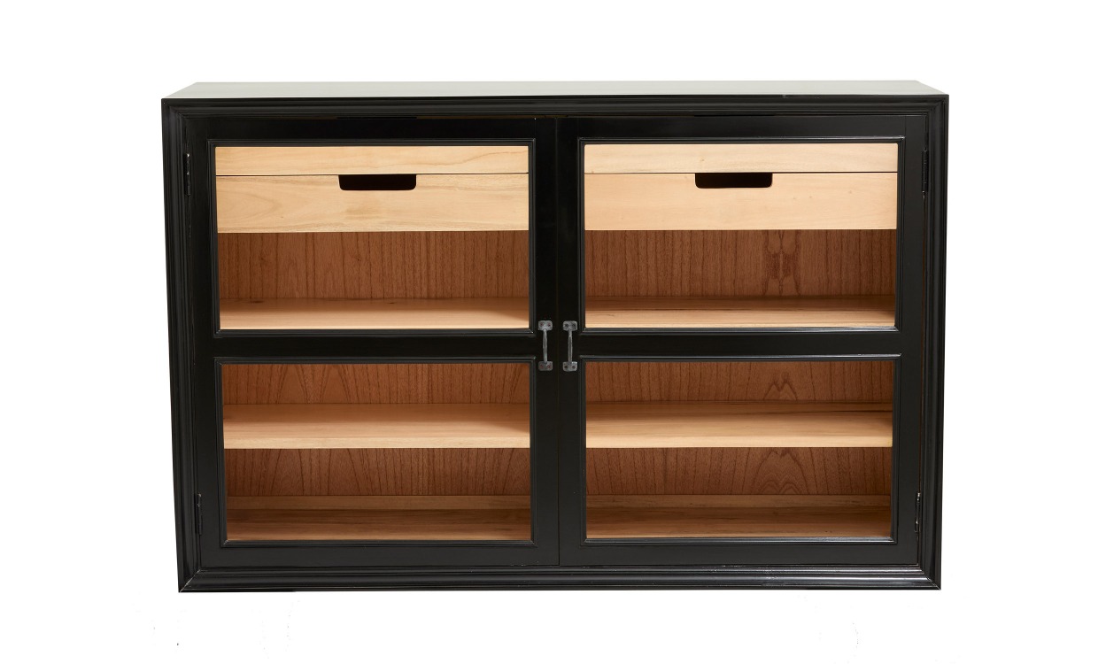 Viva är ett vitrinskåp som kombinerar modern elegans med klassisk stil. Skåpet har två glasdörrar och en svart ram med träfanér på insidan. Denna modell fungerar också som en låg skänk som är perfekt att dekorera med ljusstakar och andra detaljer. Hyllorna är justerbara i höjdled för att passa dina specifika behov.Design & egenskaperModernt vitrinskåp i klassisk stil.Glasdörrar med svart ram och träfanér på insidan.Justerbara hyllor för att passa dina behov.Eftersom skåpet är tillverkat av naturmaterial kan variationer i utseende förekomma.Har måtten 148xx44x96,5 cm.
