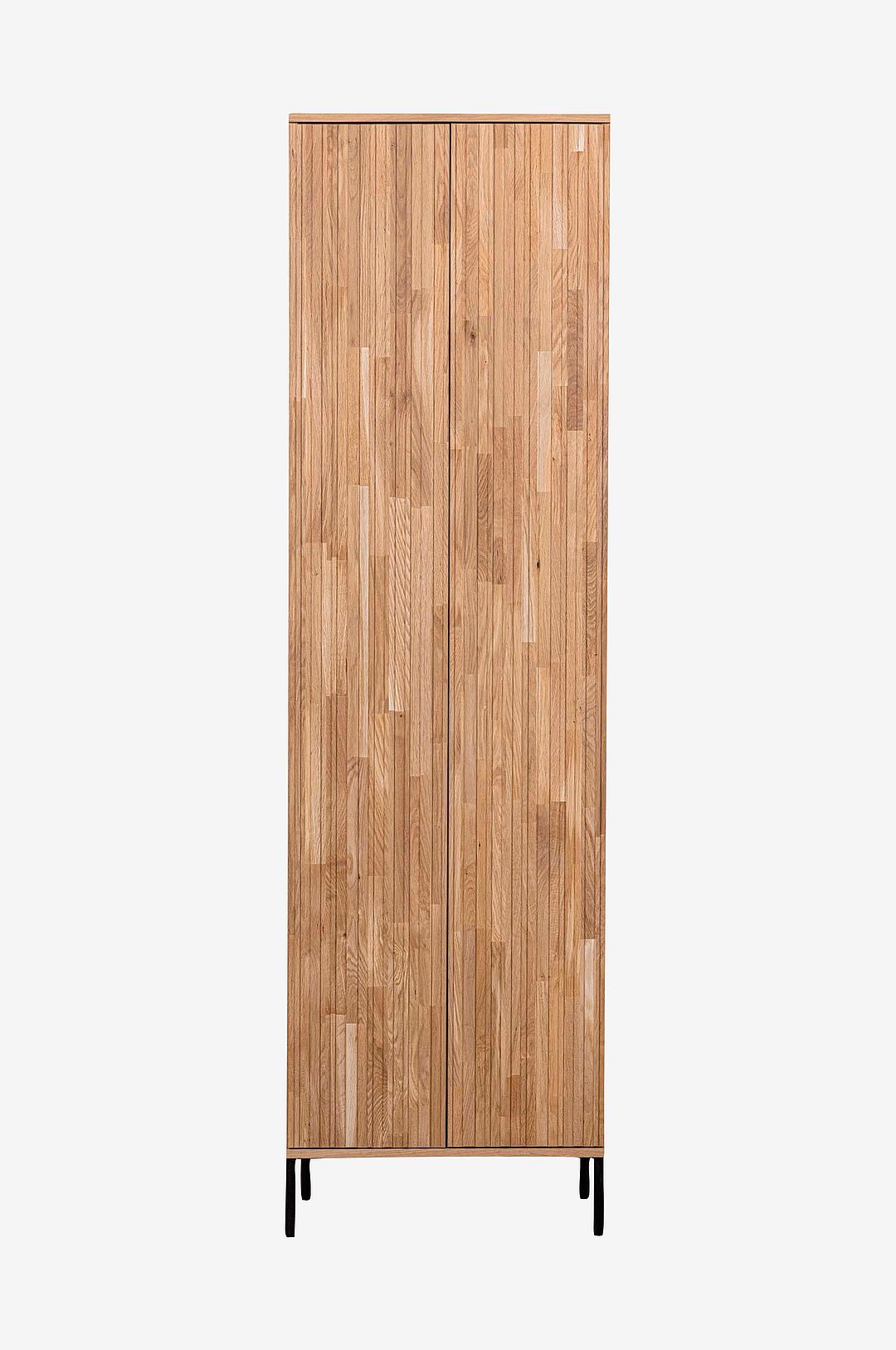 Smalt skåp med grafiskt reliefmönster på dörrarna Tillverkat av ek med svart metallstomme Smal möbel med gott om förvaringsutrymme H 210 cm x B 60 cm x D 42 cm Vår framgångsrika kollektion Gravure i ny tappning! Skåpet Gravure New ingår i en kollektion från det nederländska inredningsmärket WOOOD och är perfekt om du älskar ordning och reda. Gravure New skåp är tillverkat av ekfaner med transparent finish. Insidan är tillverkad av spånskiva i grå färg. Benen är tillverkade av svartmålad metall. Skåpet Gravure New har två dörrar med tyst tryck-och-öppna-system och en praktisk låda. Skåpet har en höjd på 210 cm, en bredd på 60 cm och ett djup på 42 cm. De två dörrarna är båda 190 cm höga, 30 cm breda och 2 cm tjocka. Dörrarna saknar handtag och har ett linjemönster som ger Gravure ett stilfullt, speciellt utseende. Skåpet har tre urtagbara hyllplan som också kan justeras i höjd. Hyllplanen skapar fem utrymmen som mäter 37x57x39 cm (höjd x bredd x djup). I utrymmet näst längst ner finns en praktisk, mjukstängande låda som mäter 14,5 cm hög, 46 cm bred och 30 cm djup. Metallbenen är 15 cm höga och har diameter 2 cm. Gravure New skåp väger 51 kg. Kombinerar du flera Gravure New-möbler bredvid varandra? Sammankoppla enkelt två skåp med ett och samma ben, ett fram och ett bak, snyggt! Ek är ett naturmaterial och vi vill framhålla att den karaktäristiska ådringen ser olika ut på varje produkt. Detta gör varje möbel unik. Produkten levereras omonterad med tydliga monteringsanvisningar. För att skydda hårda golv, sätt möbeltassar av filt under benen. Se till att tippskyddet är korrekt fastsatt för att förhindra olyckor.